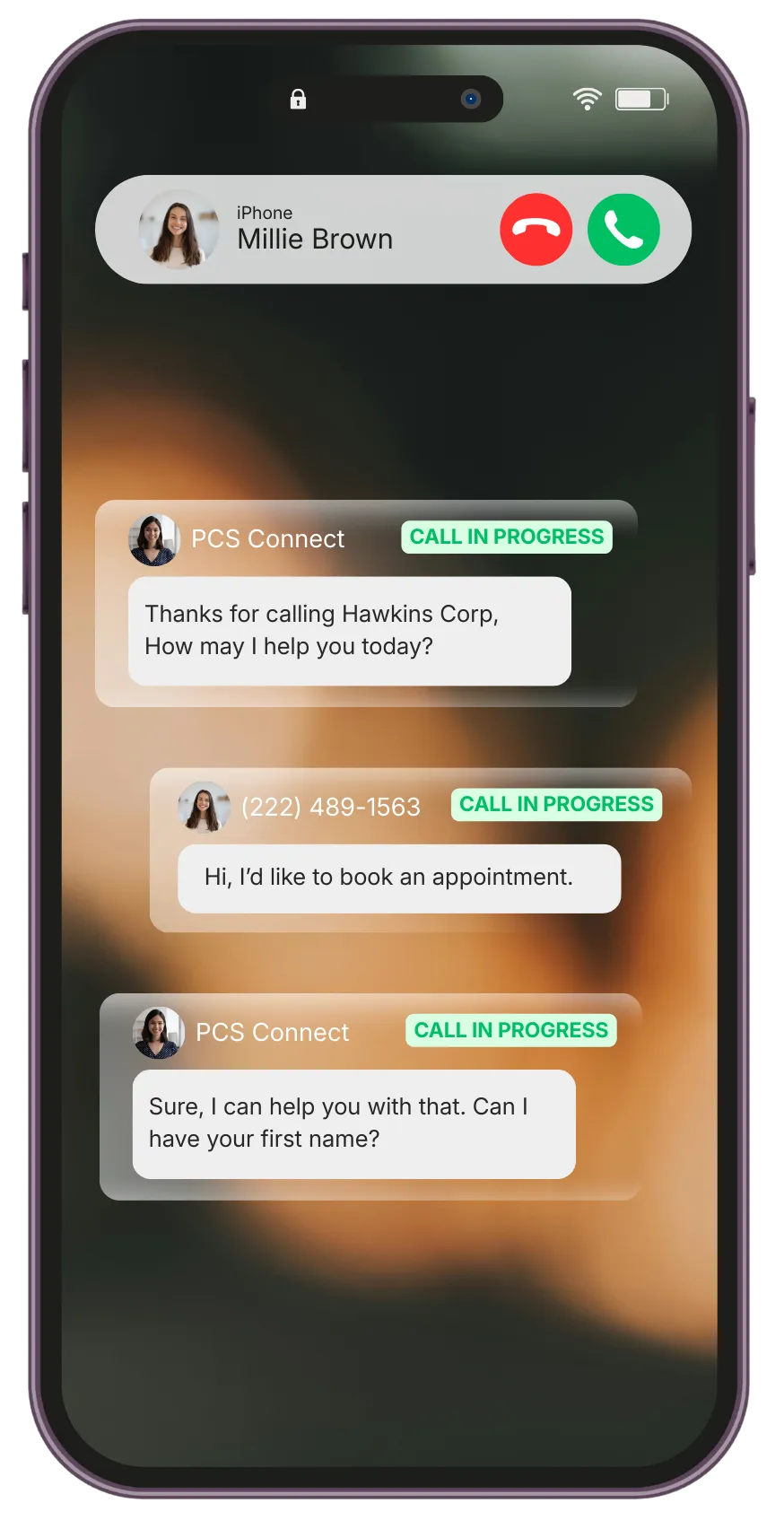PCS Connect AI is an intelligent answering service that answers your calls immediately. Unlike standard voicemail, our AI engages with callers, answers their questions, and captures the specific details you need.